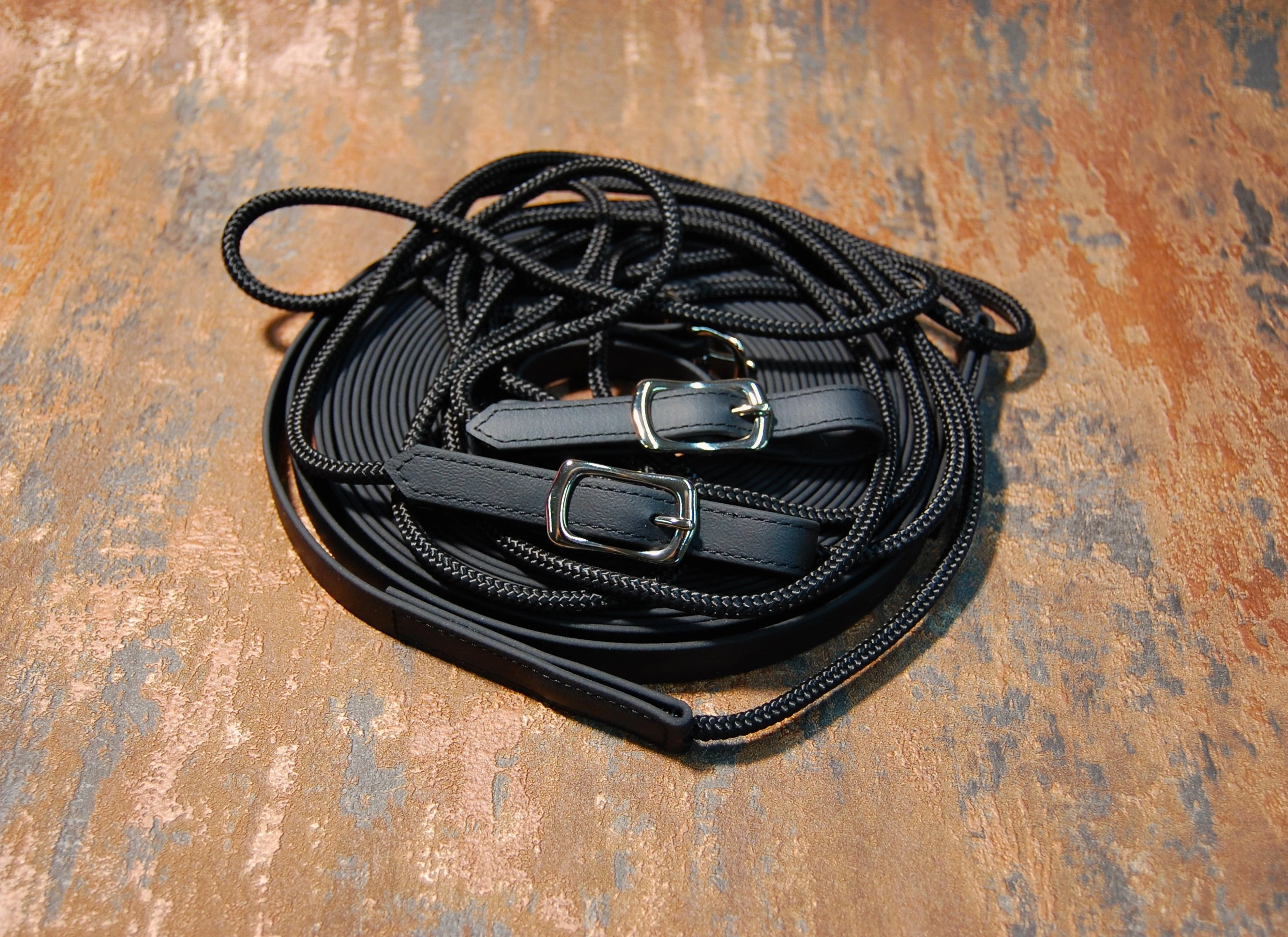 Für Freunde der Doppellongenarbeit habe ich euch hier eine Longe aus Reepschnur / Biothane mit vielen Vorteilen angefertigt : Punkt eins ist das geringe Gewicht, die Longe wiegt nur 700 g bei einer Gesamtlänge von 18 m. Die Biothane liegt sehr angenehm in der Hand und ist leicht zu reinigen.