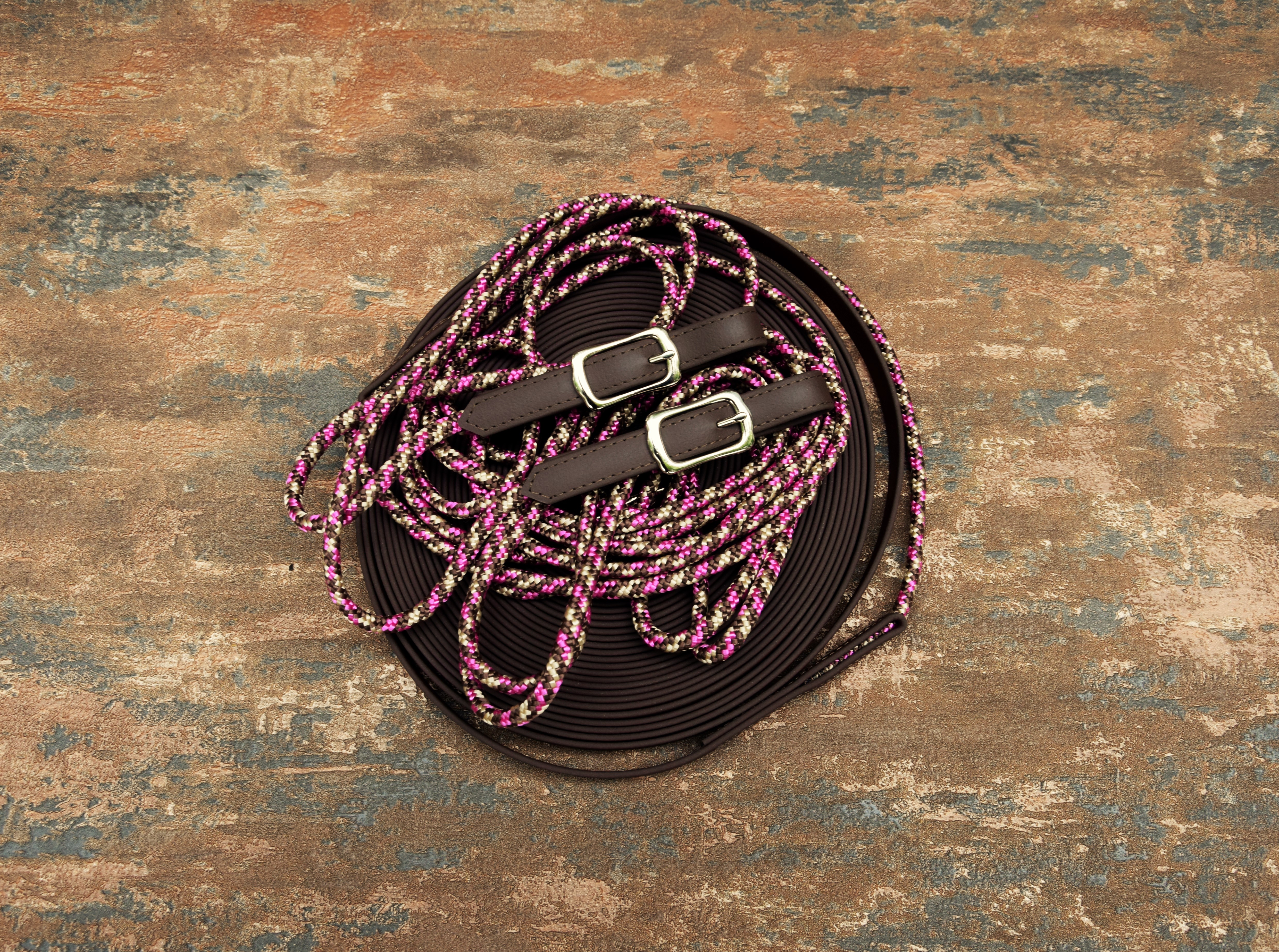 Handgefertigte Doppellonge aus meiner Werkstatt aus Reepschnur /Biothane in dunkelbraun mit Seil in cherry chocolate mit rostfreien Schnallen in silber .
