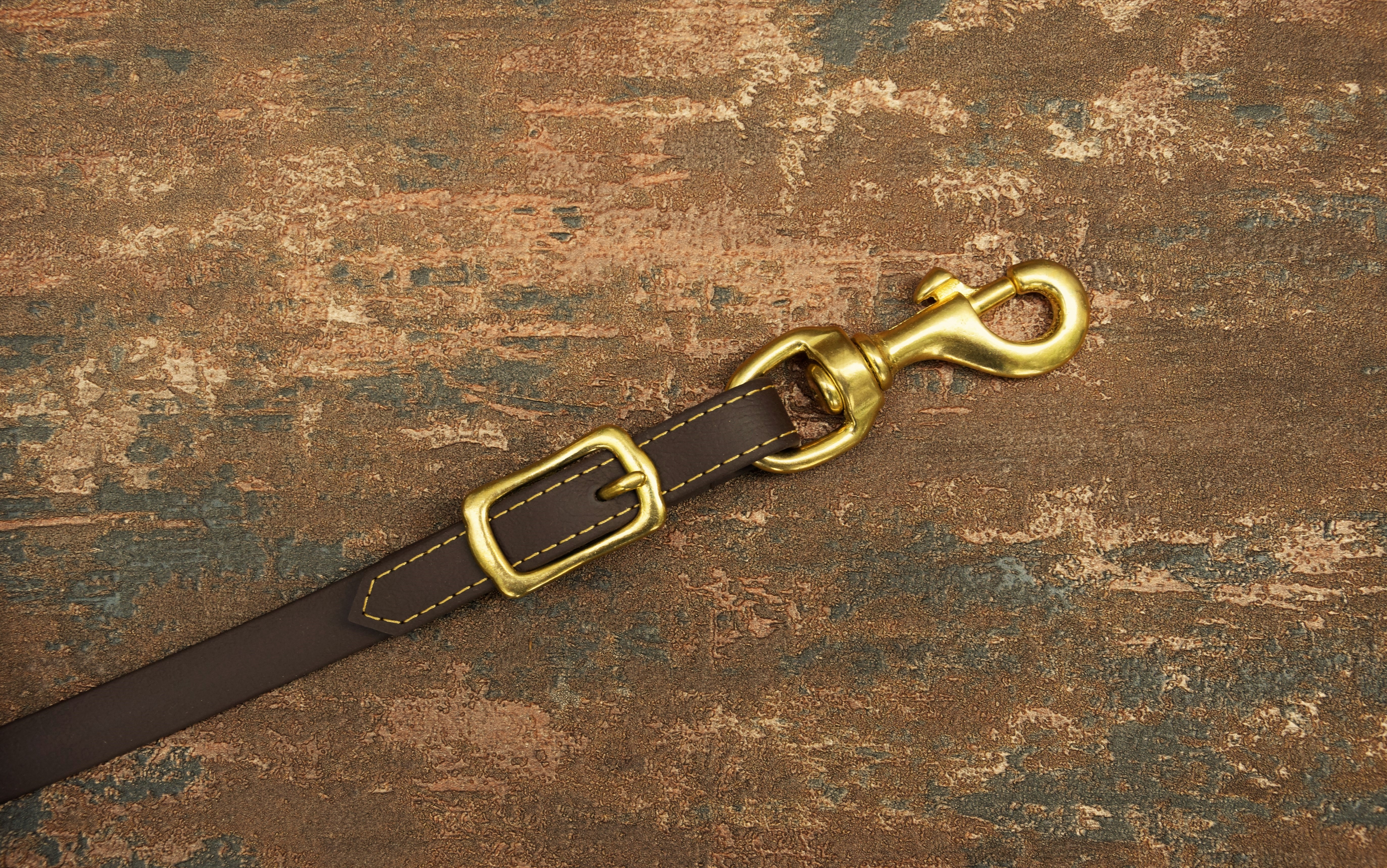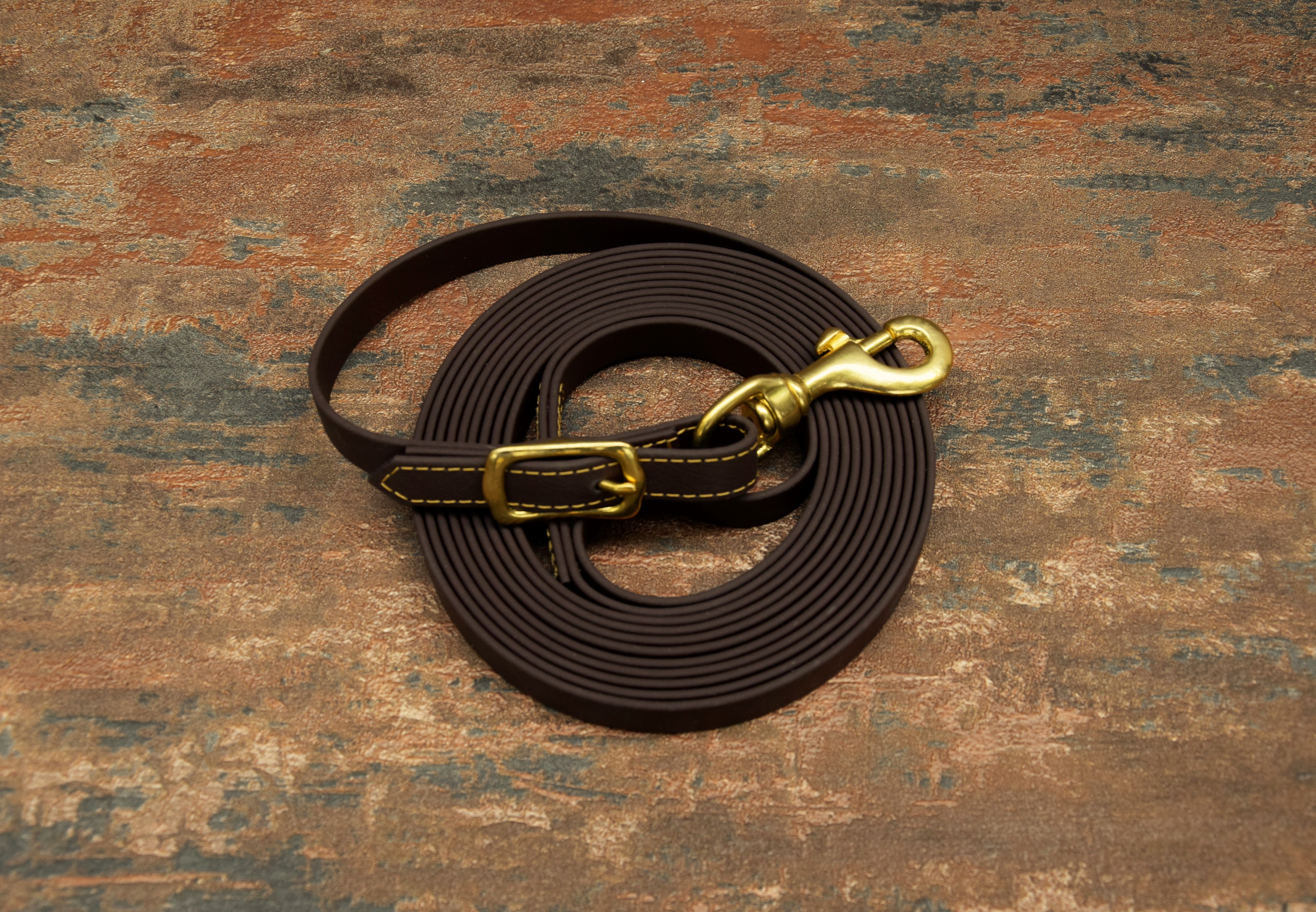 Handgefertigte Kurzlonge aus Biothane in 4,50 m Länge in dunkelbraun mit messingfarbiger Steppung. Der hochwertige Messingkarabiner kann ausgeschnallt werden, so das mit Karabiner oder mit eingeschnallter Longe longiert werden kann. Die Longe hat eine Breite von 16 mm .
