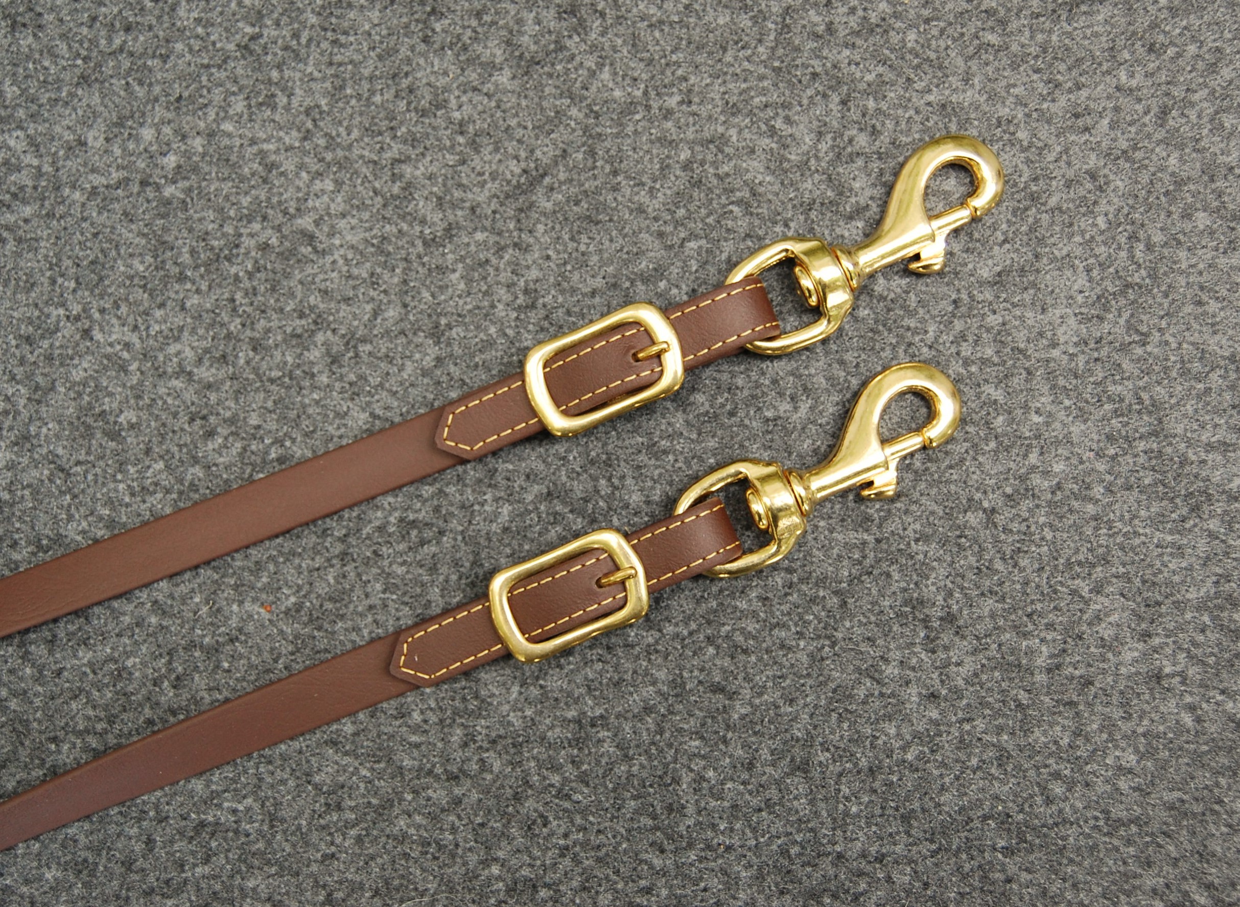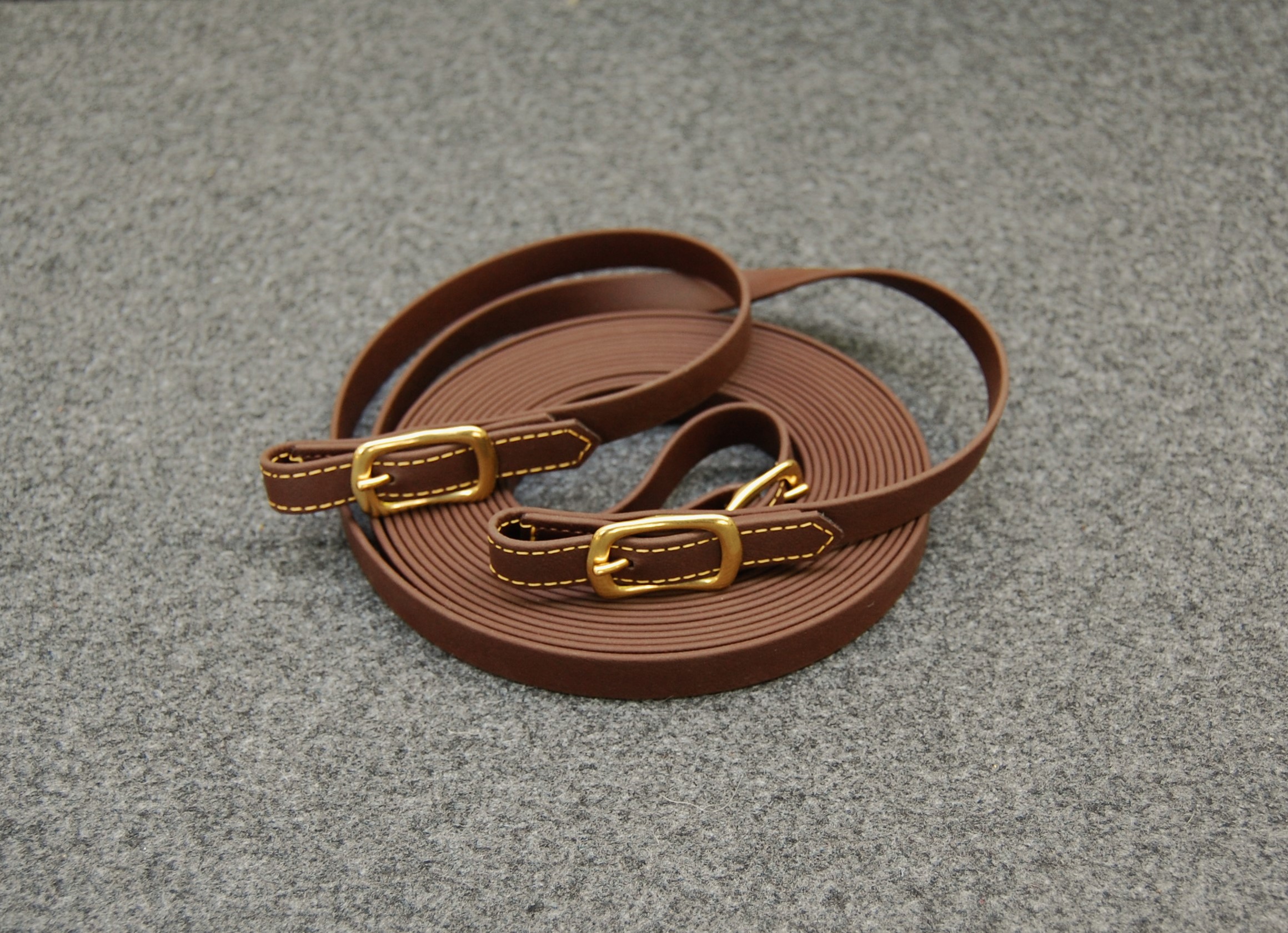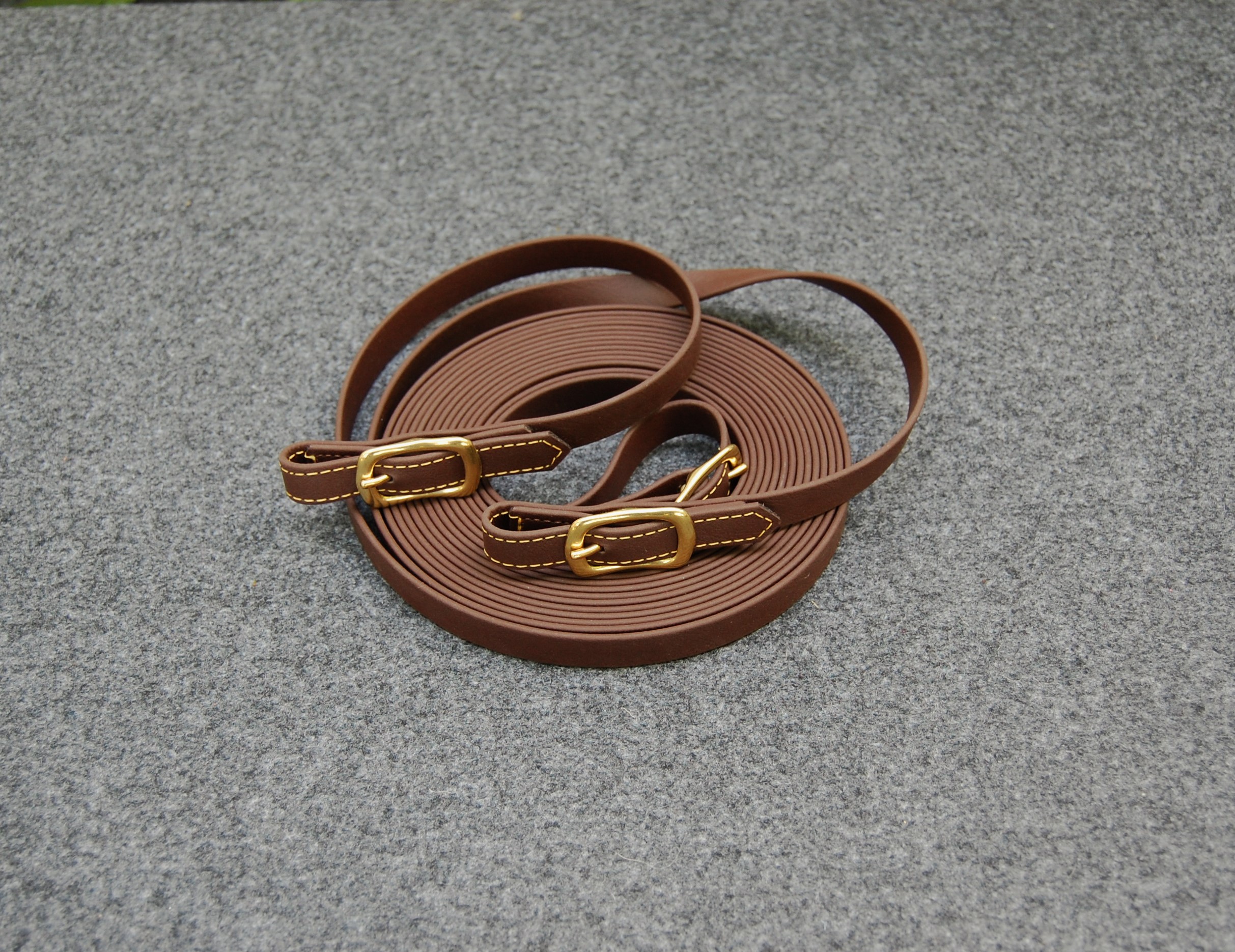 Langzügel aus Biothane in 16 mm Breite und 6,40 m Länge. Farbe dunkelbraun mit Messingschnallen. Die Zügel sind durch eine Schnalle in der Mitte teilbar. Vorne sind die Zügel zum Einschnallen. Mit messingfarbigen Kontrastnähten.