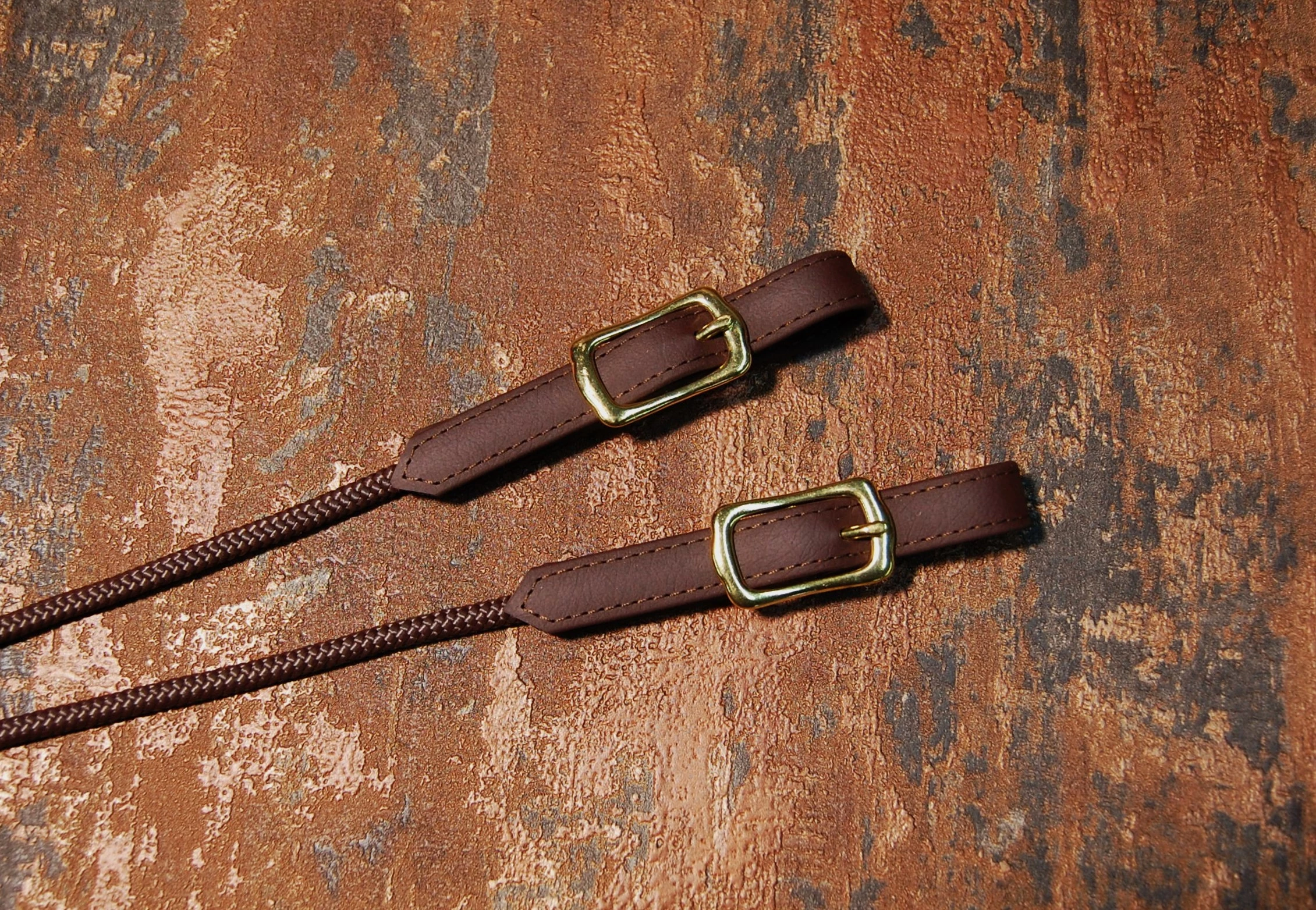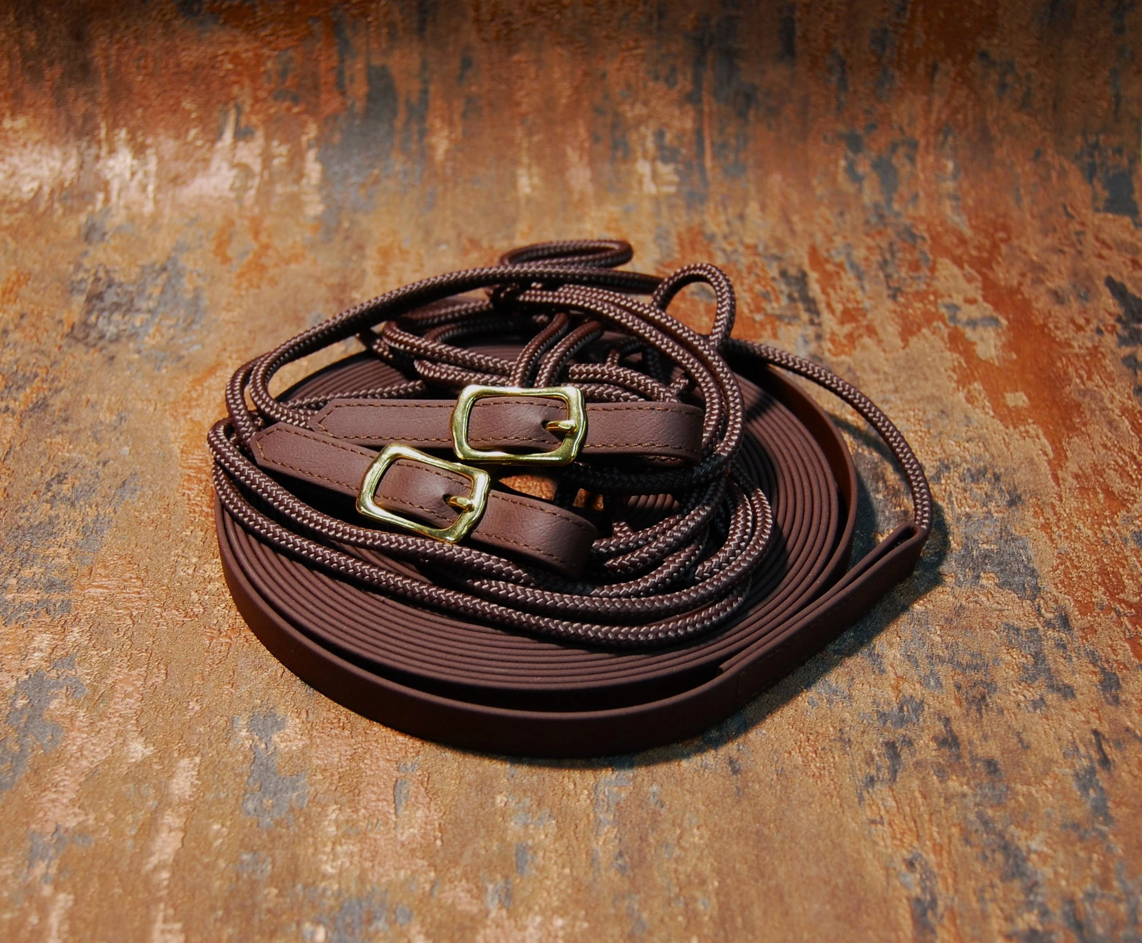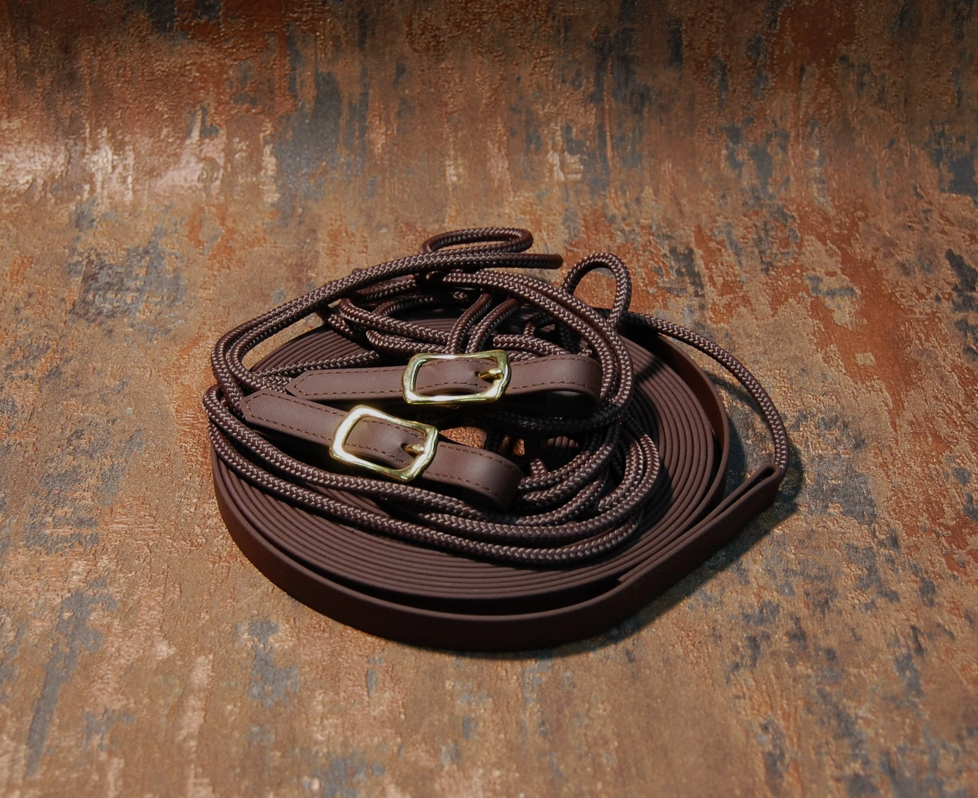 Handgefertigte Doppellonge aus Biothane-Seil in 14 m Länge, 16 mm Breite. Die Longe ist in der Farbe dunkelbraun mit gleichfarbgem Seil.