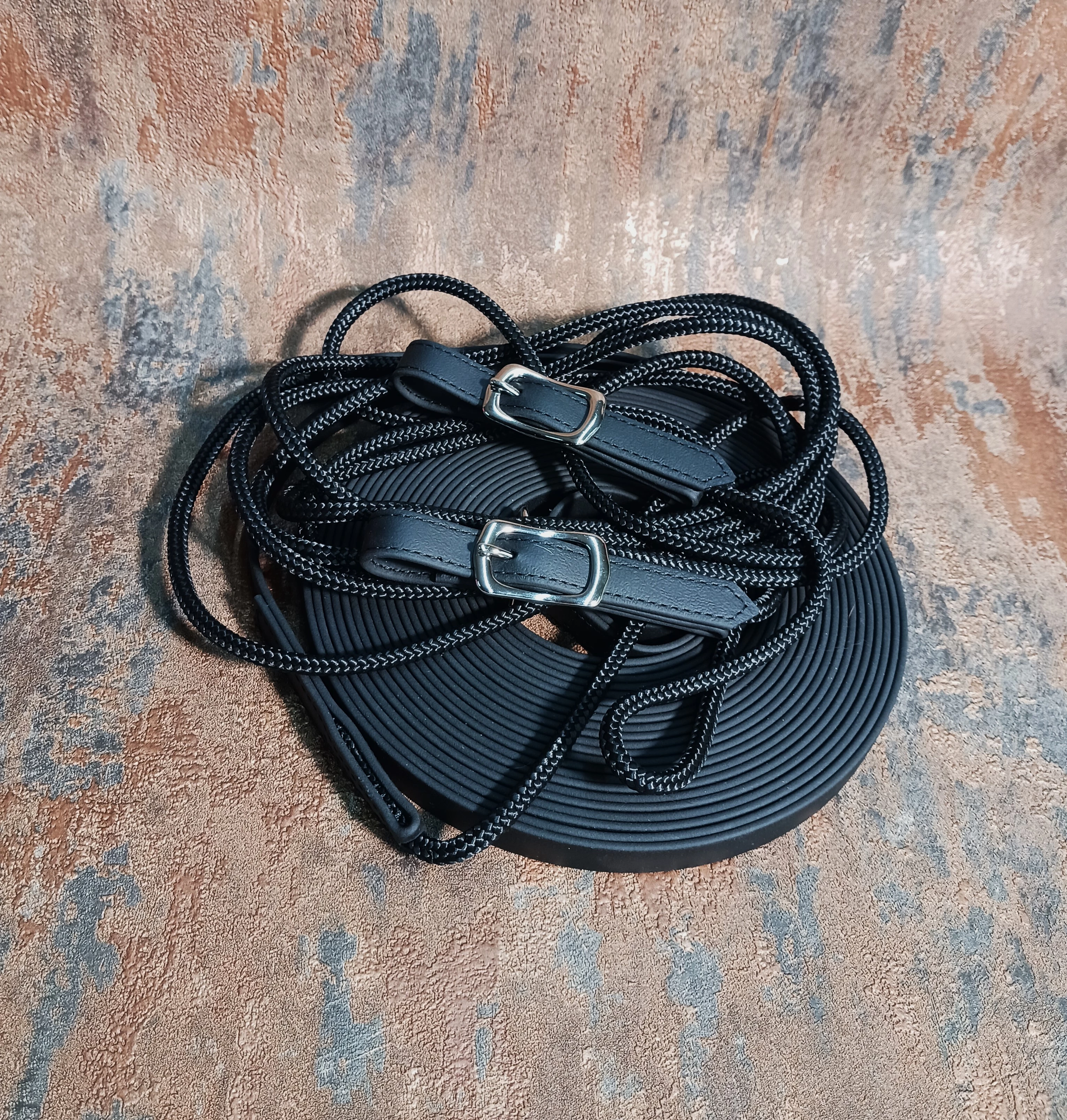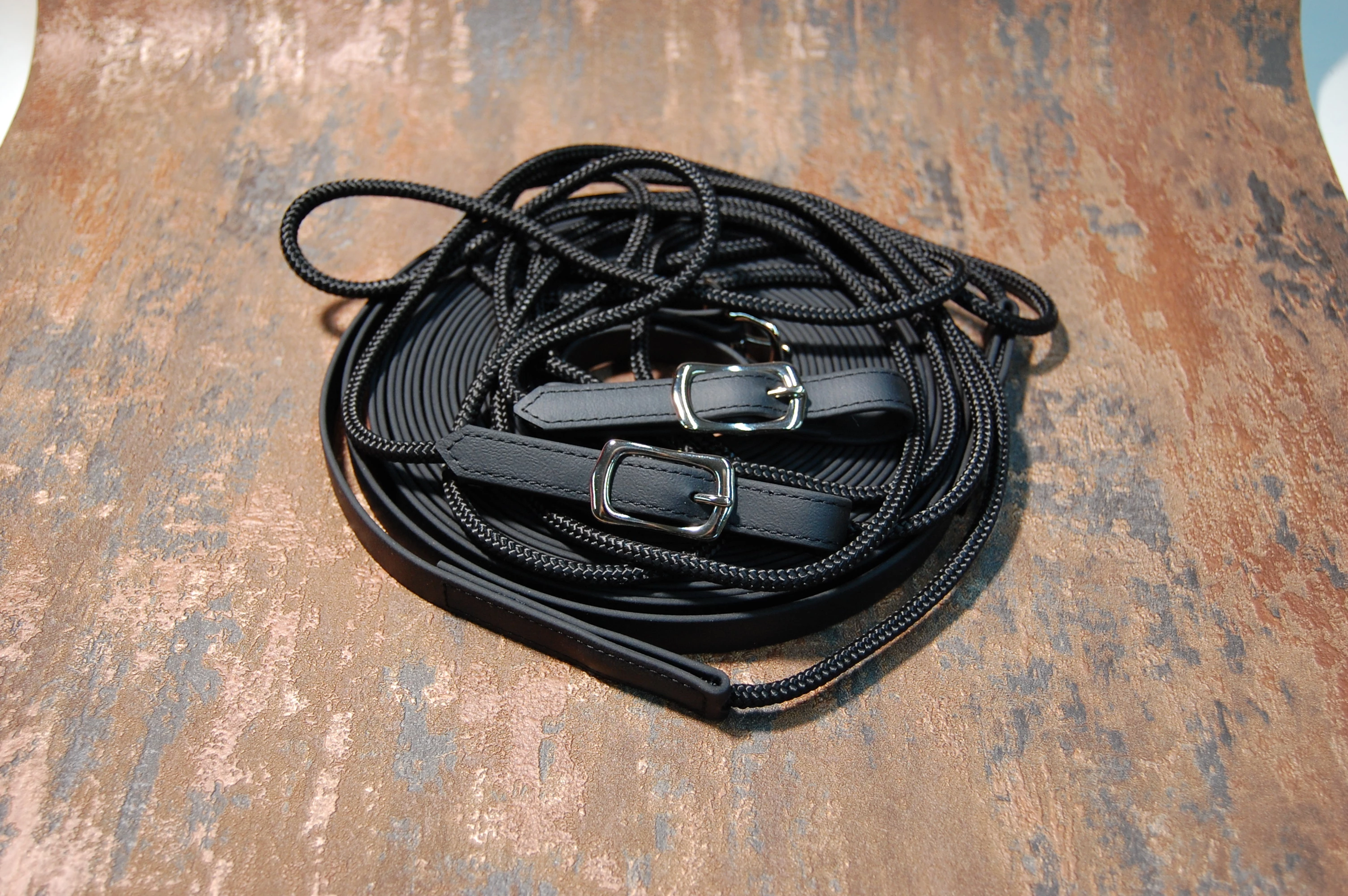 Handgefertigte Doppellonge aus Biothane-Seil in 14 m Länge, 16 mm Breite. Die Longe ist in der Farbe schwarz mit gleichfarbgem Seil.