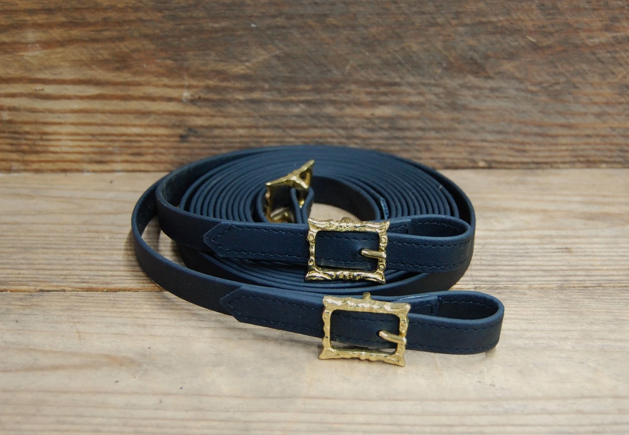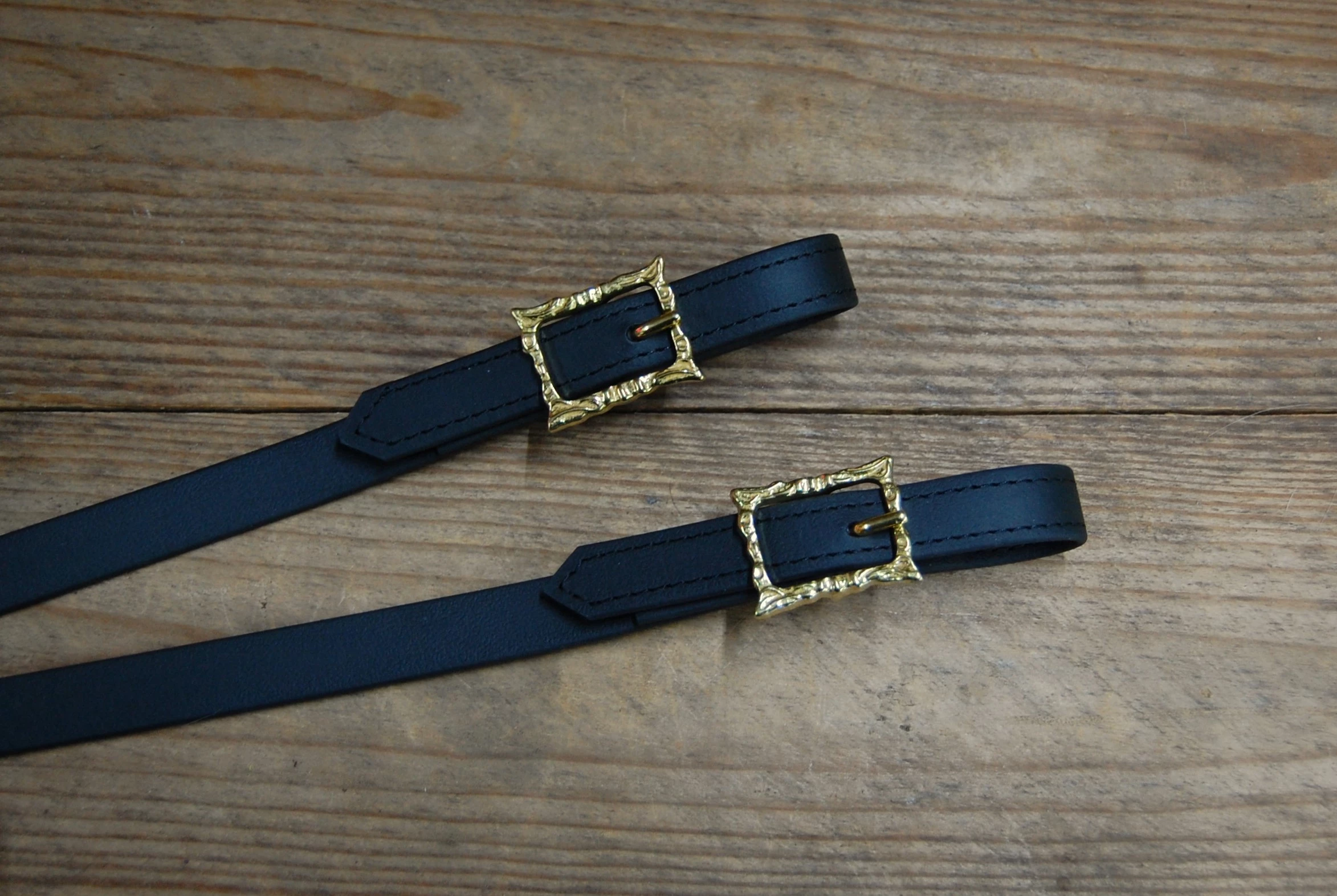 Handgefertigte schwarze Barock Langzügel aus Biothane in 16 mm Breite mit Barockschnallen in Messing . Die Zügel sind durch eine Schnalle in der Mitte teilbar. Mit eingenähten Barockschnallen, es ist nichts geschraubt.