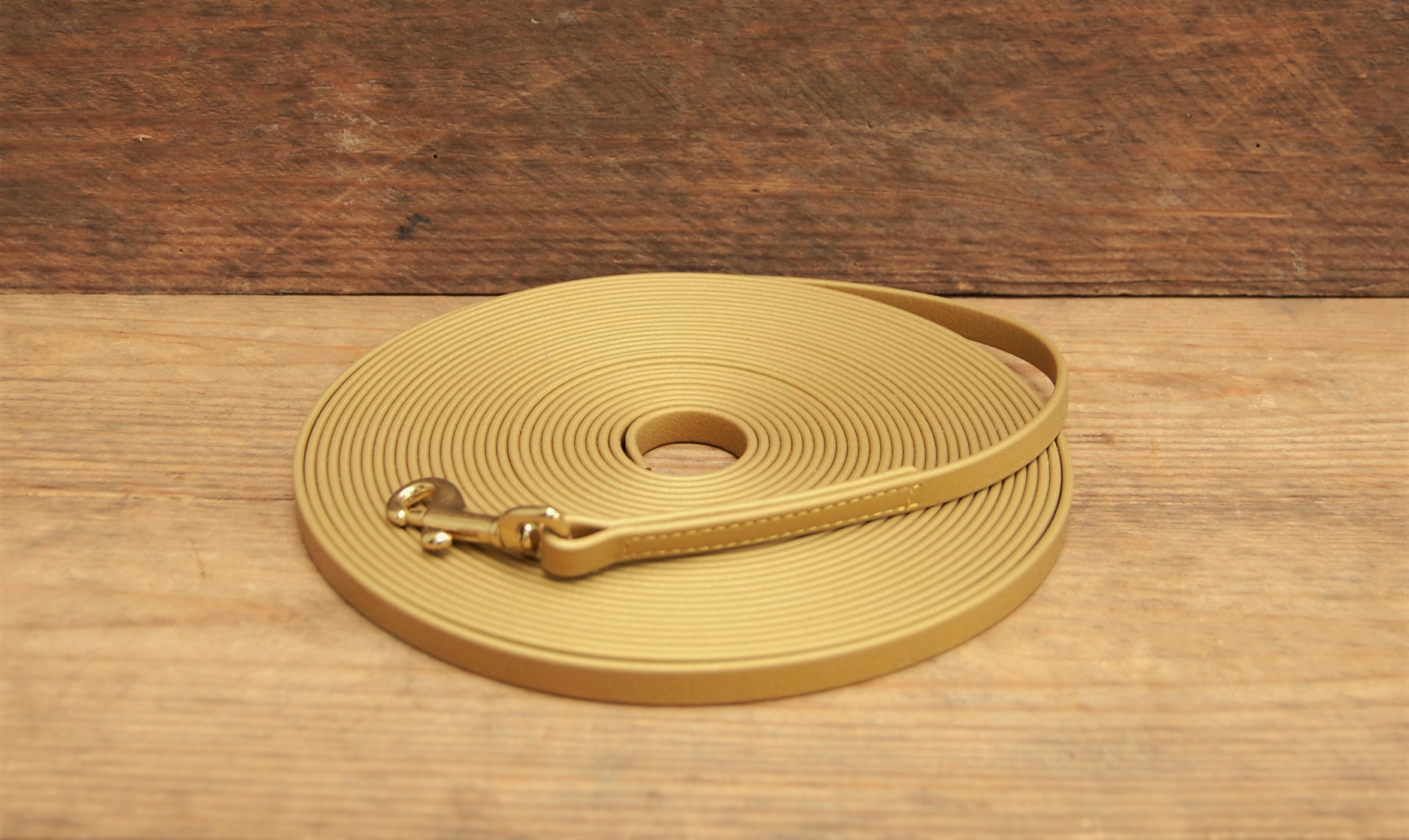 Hochwertig vernähte und kaltverschweisste Schleppleine aus Original Biothane in der Farbe gold mit rostfreiem, salzwasserbeständigen Messingkarabiner . Die Leine hat eine Breite von 9 mm und eine Länge von 10 m. Die Leine ist ohne Handschlaufe gearbeitet.